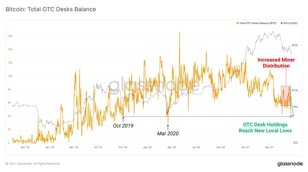 سرمایهگذاران نهادی تنها بخشی نیستند که دارایی بیت کوین خود را کاهش میدهند؛ بر اساس دادههای وب سایت تحلیلی گلاسنود (Glassnode)، میزهای معاملاتی فرابورس (OTC) و ماینرها هم در حال کاهش موجودی بیت کوین خود هستند.