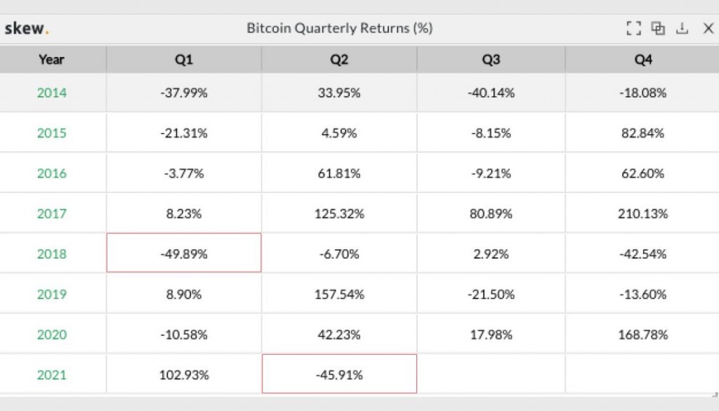 بر اساس دادههایی که وبسایت اسکیو (Skew) منتشر کرده است، قیمت بیت کوین در ۳ ماه گذشته حدود ۴۶ درصد کاهش یافته است و این دوره تاکنون ضعیفترین عملکرد را پس از ۳ ماهه اول سال ۲۰۱۸ به خود اختصاص داده است. در آغاز سال ۲۰۱۸ قیمت بیت کوین تنها در عرض ۳ ماه چیزی حدود ۵۰ درصد از اوج ۱۹,۰۰۰ دلاری خود در سال ۲۰۱۹ سقوط کرد.